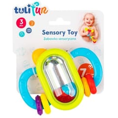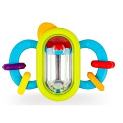 Zabawka Sensoryczna - Grzechotka Lustrzana Kompaktowa zabawka, która łączy w sobie gryzak i grzechotkę. Wyposażona jest w dwa miękkie uchwyty z wypustkami, które przyniosą ulgę obolałym dziąsłom ząbkującego malucha. Na uchwytach znajdują się kolorowe kółeczka, które można przesuwać. W środkowej części znajduje się grzechocząca, dwustronna kuleczka, dzięki czemu zabawka wydaje wesoły dźwięk przy potrząsaniu. Niewielki rozmiar grzechotki pozwala korzystać z niej zarówno w domu, jak i w podróży. Cechy produktu: - miękkie uchwyty; - ruchome elementy; - zróżnicowane faktury; - grzechotka; - zróżnicowane faktury; - kształt dostosowany do małych rączek; Wiek: 3m+