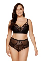 - Efektowny biustonosz bezdrutowy z miękkimi miskami wykonanymi z dzianiny oraz koronki w zwierzęcy wzór,
