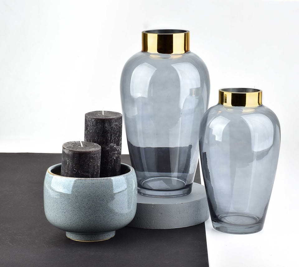 Wazon szklany Serenite marki MONDEX since 1986r. Utrzymany w kolorystyce szarej, dymionego szkła ze złotym rantem u nasady. Przepiękny i nowoczesny. W dzisiejszych czasach wazon to nietylko naczynie na kwiaty, ale także wyjątkowa ozdoba wnętrza. Świeże cięte kwiaty, a także sztuczne sprawiają, że wnętrze jest przyjemniejsze i w niektórych przypadkach może mieć duży wpływ na nasze nastawienie. Kwiaty są zawsze dobrym pomysłem na prezent, a na pewno sprawią dużo radości wręczone wraz z wazonem. Kolekcja SERENITE została stworzona aby umilać codzienność, wyjątkowy kształt wazonów, a także ich kolorystyka świetnie wpisują się w trendy, a zarazem są ponadczasowe. Nowe szkło do domu to zawsze dobry pomysł.Tak niewiele trzeba, abystół, komoda czy szafka nocna nabrały innego wymiaru i cieszyły oko.Warto zawszełączyć poszczególne elementy kolekcji ze sobą. wymiary: 15xh27cm biały kartonik: 16x16xh27cm średnica otworu: 7,4cm średnica spodu: 9,5cm waga:902g Produkt należy myć ręcznie, delikatnym środkiem myjącym.