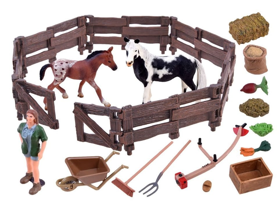- Gospodarz (około 9 cm) - postać rolnika, który dba o wszystkie zwierzęta i porządek w zagrodzie. Z figurką gospodarza dzieci mogą poczuć się jak prawdziwi opiekunowie zwierząt.- Koń (11 x 13,5 x 3 cm) - piękny wierzchowiec, który stanie się głównym bohaterem farmy, gotowy do wszelkich przygód.- Źrebak (9 x 10 x 2 cm) - młody konik, który dopełnia obraz uroczej rodziny końskiej.- Elementy zagrody - w zestawie znajdują się taczki, korytko, widły, miotła i kosiarka, które pozwolą dziecku na odtworzenie codziennej pracy na farmie.- Dodatkowe akcesoria - worek z ziarnem, bala sianka, słoma, kapusta, buraki, marchew - wszystko, czego potrzeba, by zaspokoić potrzeby zwierząt i zadbać o nie.