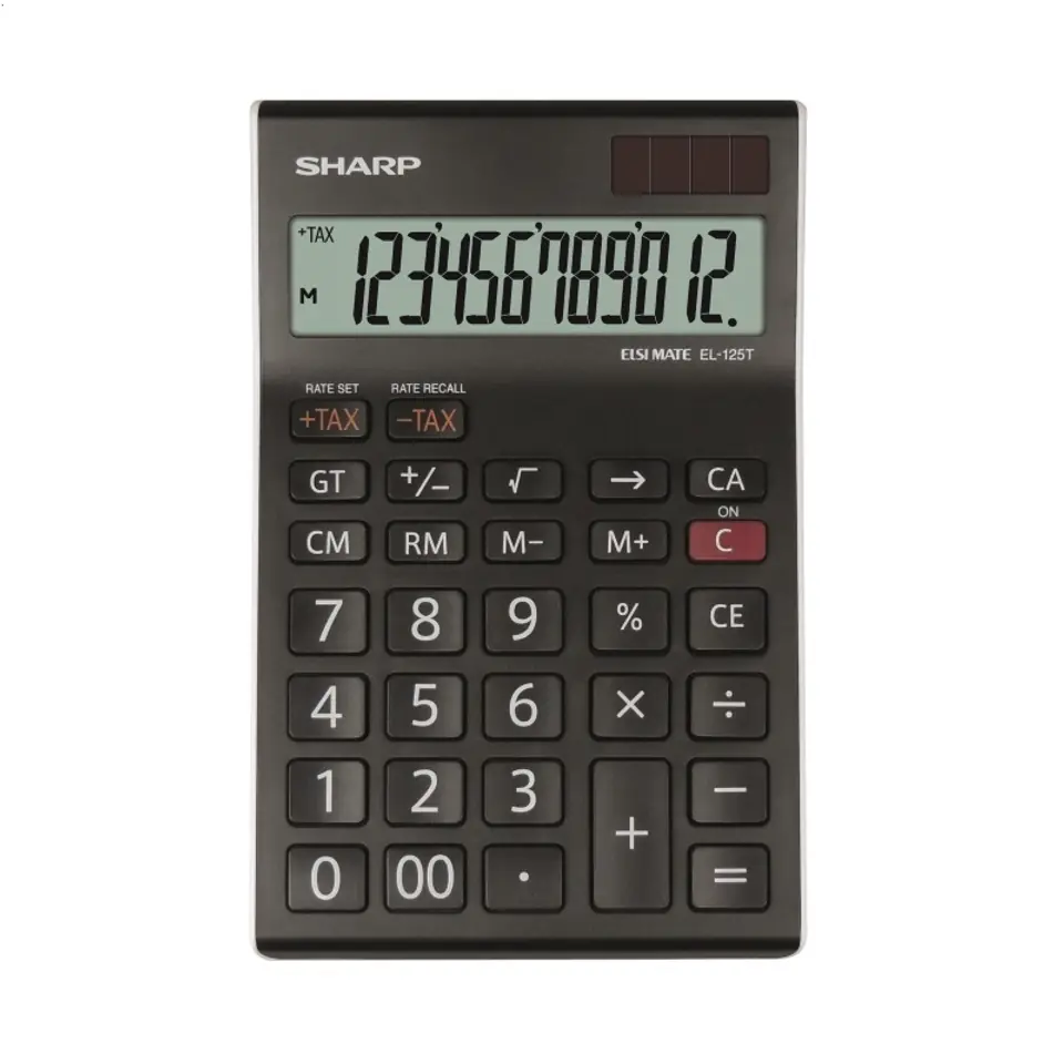 Atrakcyjny czarny kalkulator biurkowy z 12-cyfrowym wyświetlaczem, podwójnym zasilaniem, podstawowymi funkcjami matematycznymi. Dodatkowo dostępne są funkcje do pracy w biurze - liczenie z podatkiem TAX, korekcja ostatniej liczby, GT - sumowanie poszczegółnych wyliczeń oraz podwójne zero.