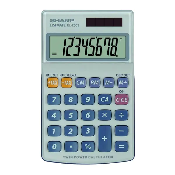 Kalkulator ręczny z 8-cyfrowym wyświetlaczem i funkcją obliczeń podatkowych.