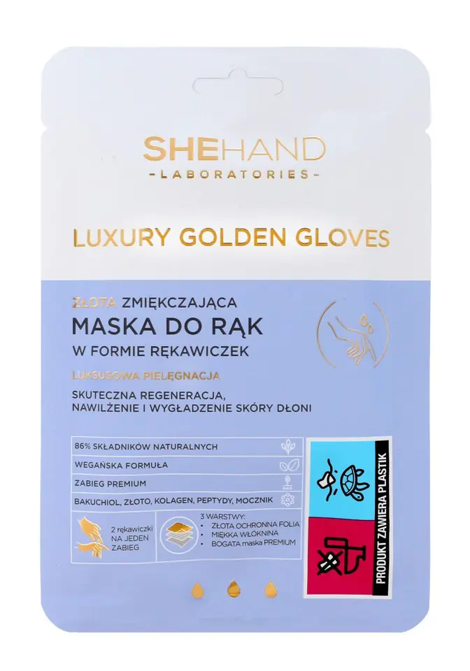 Złota zmiękczająca maska do rąk w formie rękawiczek.Skutecznie regeneruje,nawilża i wygładza skórę dłoni.