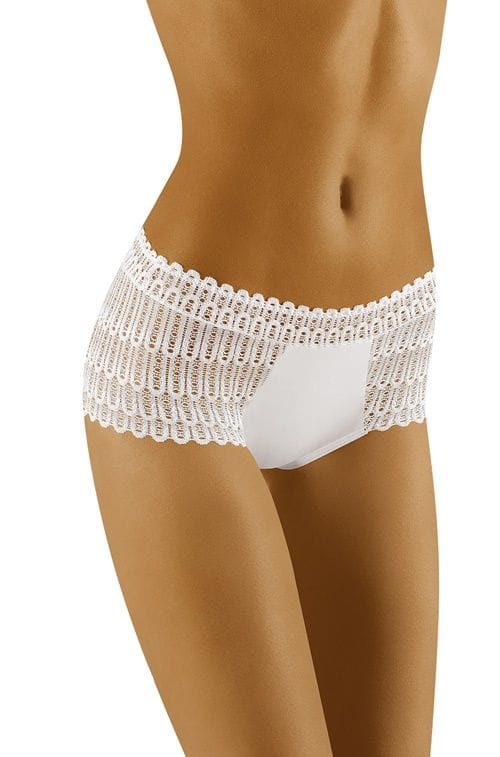 Efektowne figi niemal całkowicie wykonane z koronki. Krój a'la szorty. Tył i boki ażurowe, delikatne, bardzo kobiece. Przód uzupełnia wstawka z gładkiej, komfortowej tkaniny, która nie prześwituje. Skład: 83% poliamid, 17% elastan.