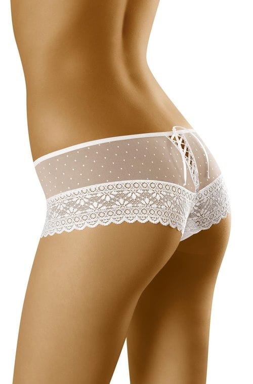 Urocze shorty w kropeczki, z koronkowym wykończeniem wokół ud. Mają w sobie coś z kokieterii, a do tego są niesamowicie wygodne. Wysoka jakość, znana marka. Skład: 83% poliamid, 17% elastan.