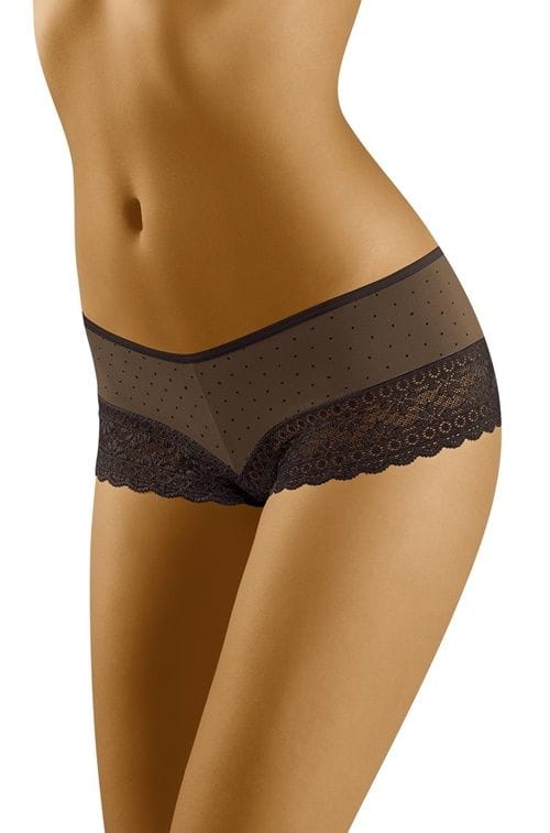 Urocze shorty w kropeczki, z koronkowym wykończeniem wokół ud. Mają w sobie coś z kokieterii, a do tego są niesamowicie wygodne. Wysoka jakość, znana marka. Skład: 83% poliamid, 17% elastan.