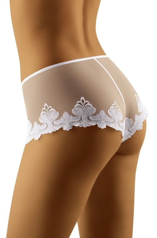 Intrygujące, kobiece i zmysłowe - białe szorty wykonane z pięknie haftowanej koronki. Haft w rejonie ud, o nieco orientalnym wyrazie. Skład: 87% poliamid, 13% elastan.