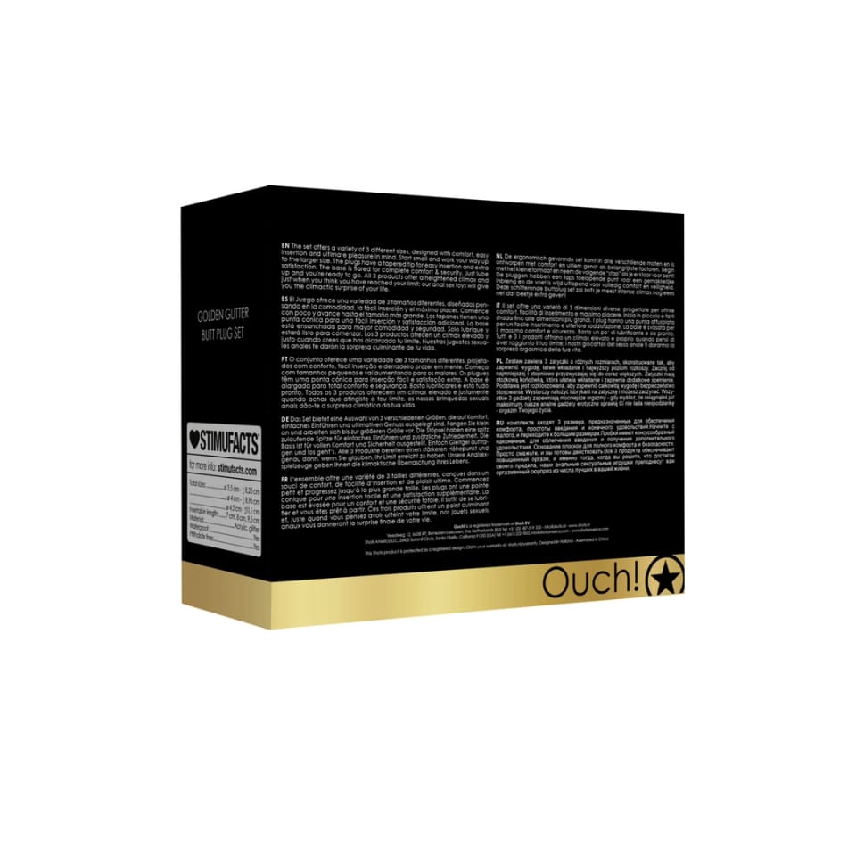 Shots Butt Ouch! – zestaw trzech akrylowych zatyczek anatomicznych to propozycja dla osob poszukujących funkcjonalnych, estetycznych i wygodnych rozwiązań w kategorii akcesoriow intymnych. W komplecie znajdują się trzy modele o zrożnicowanych rozmiarach, wykonane z wysokiej jakości akrylu o gładkiej powierzchni, co zapewnia łatwość użytkowania oraz komfort w każdej sytuacji.
