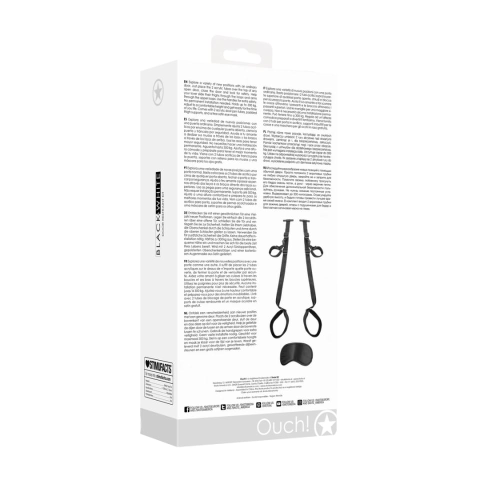 Shots Ouch! Uprząż drzwiowa z wyściełanymi podporami i maską to nowoczesny system do montażu na drzwiach, ktory pozwala na szybkie i łatwe rozszerzenie możliwości codziennego wyposażenia o funkcjonalność do rożnorodnych form aktywności partnerskiej. Produkt ten nie wymaga instalacji na stałe – wystarczy umieścić dwie wytrzymałe akrylowe rurki na gornej krawędzi drzwi, zamknąć je i zabezpieczyć, aby stworzyć solidny punkt oparcia.