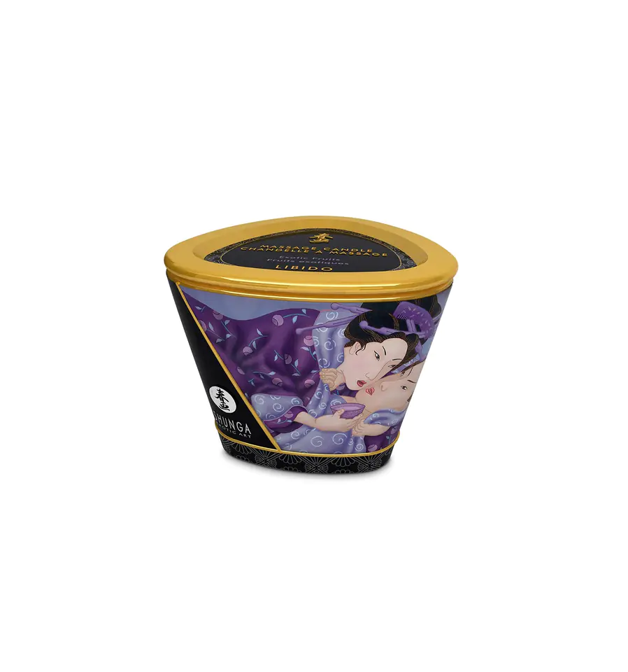 Świeca do masażu marki Shunga o zapachu owoców tropikalnych. Wyprodukowana została na bazie soi i wyselekcjonowanych olejów roślinnych, bez użycia parabenów, cukru i glutenu. Odpowiednia dla wegan. Płyn powstały z roztopionej świecy ma odżywczy wpływ na skórę, nadając jej delikatną gładkość. Nie zatyka porów. Świeca może palić się aż do 40 godzin.