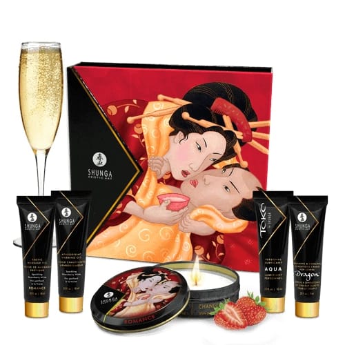 Zestaw marki Shunga do masażu erotycznego o smaku musującego wina truskawkowego.