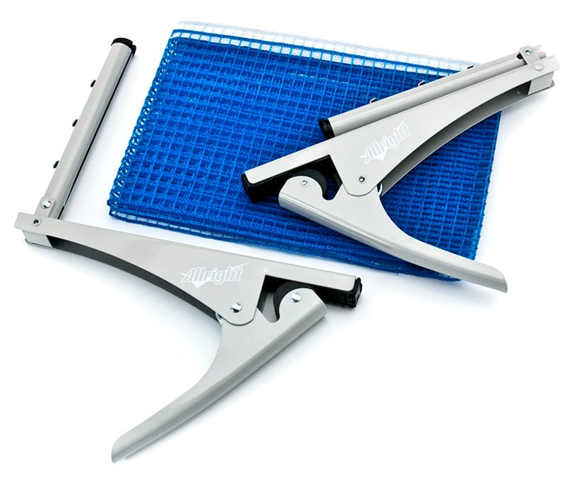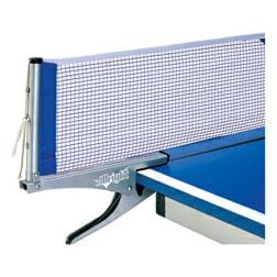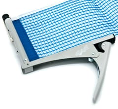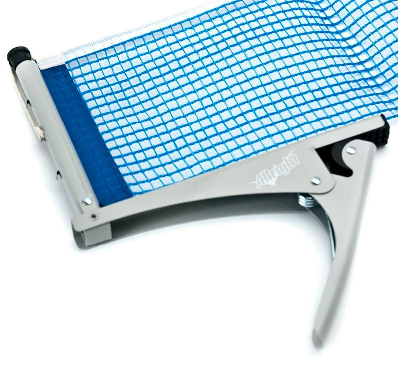 Zestaw: uchwyty typu clip z siatką. To trwałe i solidne rozwiązanie do tenisa stołowego wykonane z metalu. Uchwyty z regulacją wysokości ze składanymi słupkami. Szybki i łatwy sposób montażu do stołu na clip z mocną sprężyną zapewniającą pożądaną stabilność. - Długość siatki ok 178cm - Wysokość siatki: 15cm - Kolor siatki: niebieski - Mocowanie za pomocą zacisków clip - Regulacja wysokości siatki - Materiał: uchwyty: stal, guma, PVC; siatka: tworzywo sztuczne; naciąg z linki bawełnianej