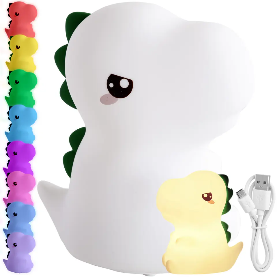 Nocna lampka led DINOZAURSilikonowa lampka nocna Dinozaur LED RGB 16 kolorówZasilanie: akumulatorowe Efektowne magiczne oświetlenieLampka nocna Dinozaur to niezwykły produkt, który zachwyci wszystkie dzieci, jak i dorosłych. Ta urocza lampa została wykonana z miękkiego i bezpiecznego silikonu, co oznacza, że nie zawiera żadnych toksycznych substancji. Dzięki temu produkt ten jest idealny nawet dla najmłodszych użytkowników, zapewniając im bezpieczny sen i magiczny nastrój. Lampka posiada certyfikaty CE i ROHS. Głównym jej atutem jest uroczy kształt słodkiego dinozaura, który zachwyci każdego miłośnika prehistorii. Jednak to nie wszystko, co ma do zaoferowania. Ta wyjątkowa lampka posiada bogatą paletę kolorów RGB, co oznacza, że możesz dostosować jej oświetlenie do swojego nastroju i preferencji. Wyposażona jest we wbudowany akumulator, który można łatwo naładować za pomocą standardowego kabla USB. Dzięki temu nie musisz martwić się o częste wymiany baterii, a jedno naładowanie wystarczy na wiele godzin magicznego oświetlenia. Dodatkowo antypoślizgowe podkładki zapewniają stabilność lampki, nawet na gładkich powierzchniach. Jej ciepłe, uspokajające światło sprawia, że jest idealna do usypiania dzieci. Wprowadza delikatne i przyjemne oświetlenie, czyniąc otoczenie przyjaznym i niedrażniącym oczu. Warto również podkreślić, że lampka Dinozaur nie tylko doskonale sprawdza się w nocy, ale także w ciągu dnia. Jej uroczy design i różnorodność kolorów czynią ją zapierającą dech w piersiach dekoracją, która doda uroku każdemu wnętrzu. To nie tylko lampa, to również element wystroju, który przyciągnie uwagę i sprawi, że Twoje pomieszczenie stanie się jeszcze bardziej przytulne. W skrócie, lampka nocna Dinozaur to nie tylko źródło światła, ale także źródło uroku, magii, relaksu i stabilności. Dzięki jej miękkiemu materiałowi, szerokiej palecie kolorów, wbudowanemu akumulatorowi, praktycznemu ładowaniu USB i antypoślizgowym podkładkom, jest to produkt, który spełni oczekiwania każdego, kto poszukuje niezwykłego oświetlenia do pokoju dziecięcego. Odkryj magię lampki Dinozaur i wprowadź ją do swojego życia już dziś! Zalety:✅Najwyższa jakość materiałów✅Bezpieczna i nietoksyczna✅Bogata paleta kolorów RGB✅Uroczy kształt lampki✅Idealna do usypiania dzieci✅Zasilanie akumulatorowe✅Brak ostrych krawędzi✅Nie nagrzewa się Specyfikacja:Materiał: silikon, ABSDiody: LED RGBIlość kolorów: 16Zmiana jasności: takEkologiczny: takZasilanie: akumulator (wbudowany)Pojemność akumulatora: 1200 mAhKabel micro USB w zestawie: takSterowanie za pomocą stuknięciaCertyfikaty: CE, ROHSZestaw zawiera: lampkę, kabel micro USB, instrukcję w j. polskim, oryginalne opakowanieWaga z opakowaniem: 0,25 kgWymiary:Wysokość: 14 cmSzerokość: 9 cmGłębokość: 12 cm Bogata paleta 16 kolorów RGB z płynnym przejściem między kolorami UWAGA | Przedstawione kolory należy traktować poglądowo - mogą odbiegać od rzeczywistych ze względu na różne ustawienia monitorów oraz proces obróbki zdjęć • Rzeczywiste wymiary mogą się różnić od podanych w opisie. Tolerancja błędów może wynosić +/- 2 cm