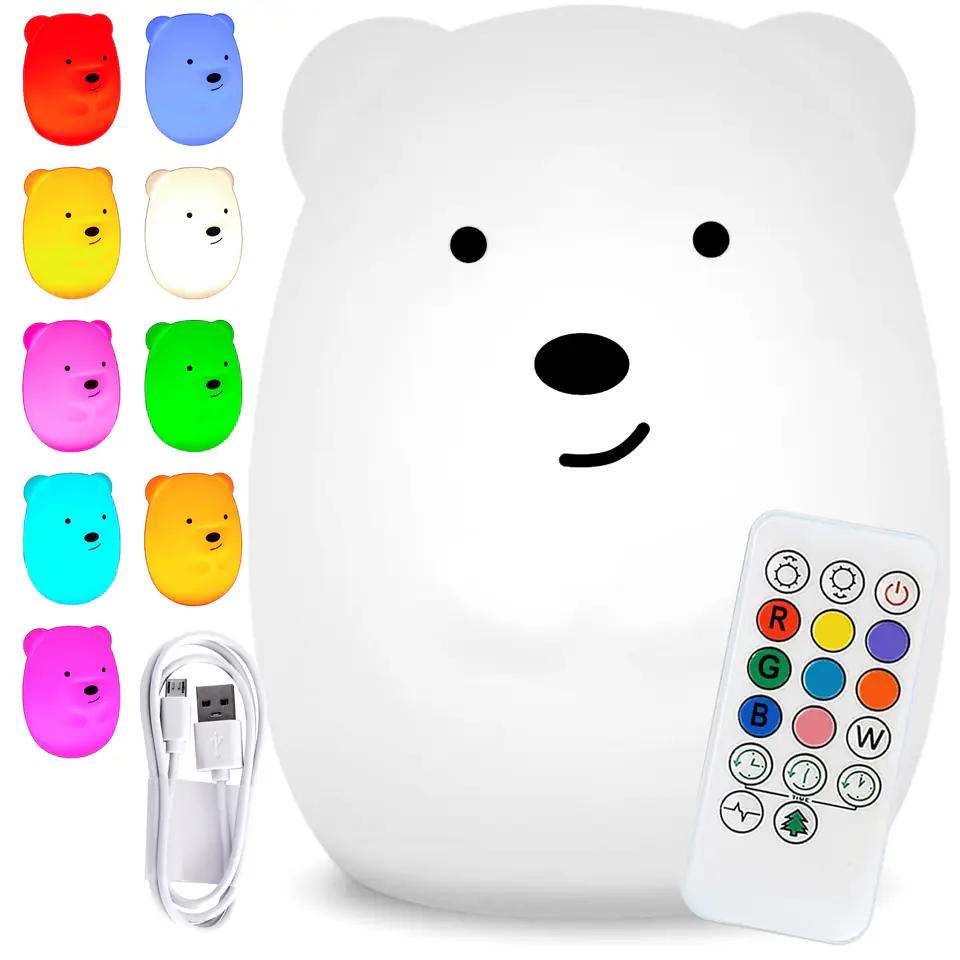 Silikonowa lampka nocna Misiek led rgbPrzeznaczenie: dla dzieci | Kolory: 9 barw świecenia Lampka nocna w kształcie słodkiego misia LED idealnie nadaje się na prezent dla Twojego dziecka. Lampa wykonana z miękkiego i bezpiecznego silikonu, nie zawiera żadnych toksycznych substancji. Dzięki temu produkt nadaje się również dla najmłodszych. Ten uroczy misiek posiada 3 tryby pracy, 9 kolorów i 3 timery. Dzięki uspokajającemu, ciepłemu światłu można przy tym bardzo łatwo zasnąć. Lampka nocna led zasilana jest za pomocą x3 baterii AAA lub kabla usb znajdującego się w zestawie. Sterowanie odbywa się za pomocą pilota zdalnego sterowania lub za pomocą stuknięć w lampkę. W nocy służy jako lampka nocna obok łóżka. W ciągu dnia zamienia się w zapierającą dech w piersiach dekorację. "Adoptuj" swojego własnego msia, aby cieszyć się jego wielofunkcyjnością. Cechy produktuDiody LED RGB3 tryby pracy9 kolorów3 timeryZmiana jasnościTryb miganiaTryb płynącyTryb ciągłyEkologicznyNietoksyczny silikonBrak ostrych krawędziNie nagrzewa sięZasilanie bateryjne 3xAAA(brak w zestawie) lub kabel USB 80 cm(w zestawie)Sterowanie za pomoca załączonego pilota lub stuknięć w lampkę Wymiary:Wysokość 15 cmSzerokość 12,5 cmGłębokość 12,5 cm Informacje dodatkowePrzedstawione kolory należy traktować poglądowo - mogą odbiegać od rzeczywistych ze względu na różne ustawienia monitorów oraz proces obróbki zdjęć. Rzeczywiste wymiary mogą się różnić od podanych wyżej. Tolerancja błędów może wynosić +/- 5%. Marka:GockowiakKod produktu:328842MGIlość trybów świecenia:trzy: ciągły, płynący, miganieWysokość: 15 cmSzerokość:12,5 cmGłębokość:12,5 cmZasilanie:5V-1A / kabel USB w zestawieSterowanie:pilot lub stukanie ręką w lampkę