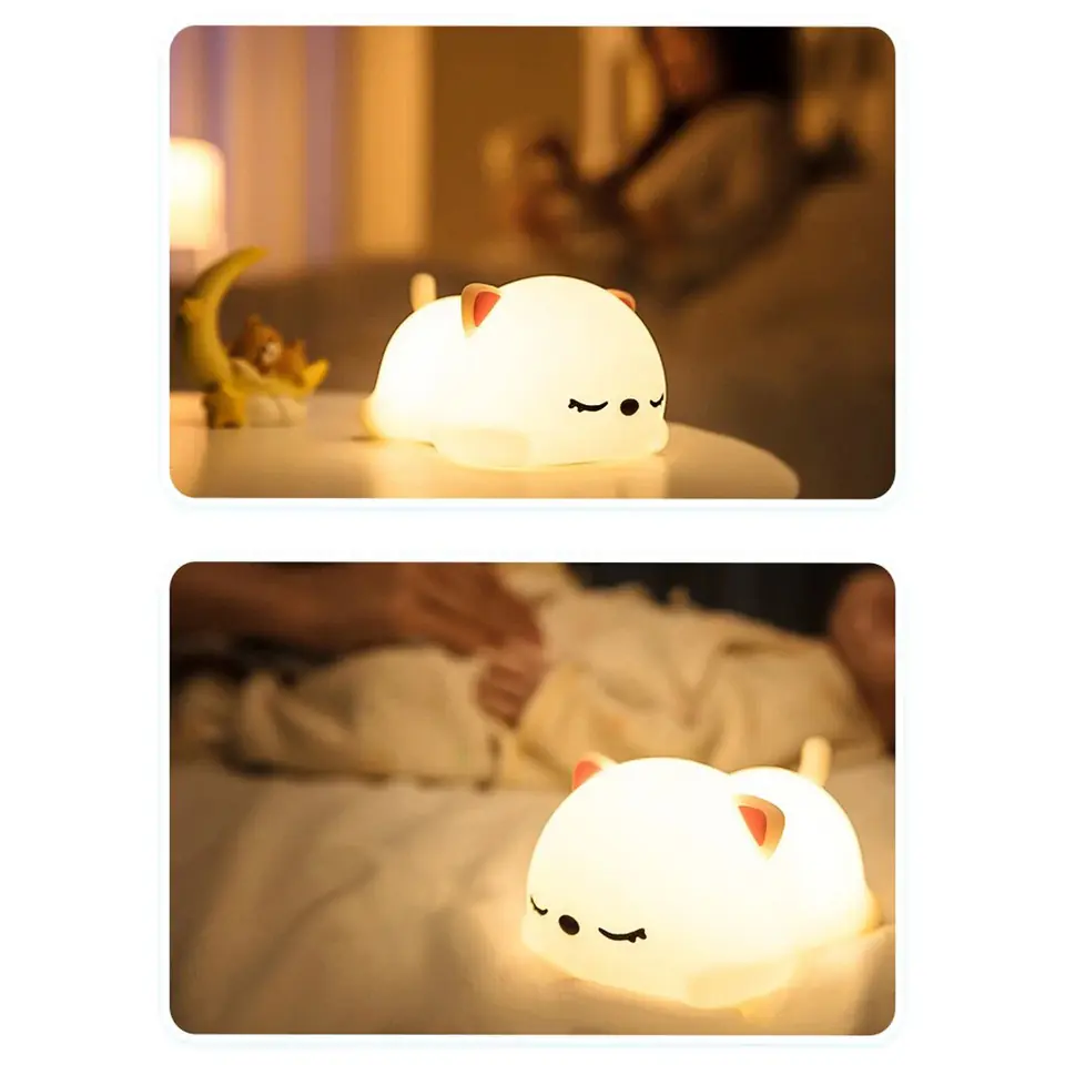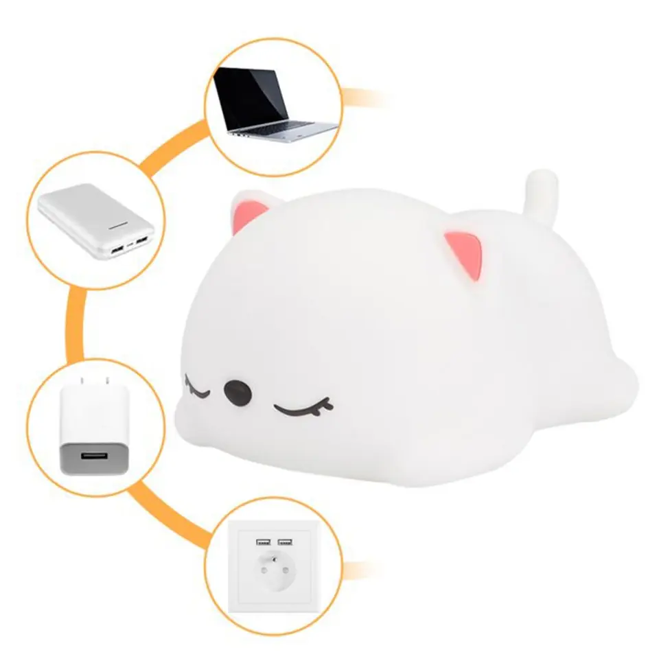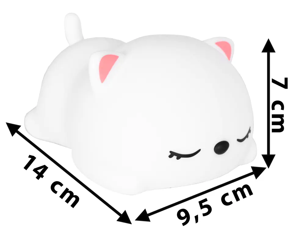 Nocna lampka led KOTEK Silikonowa lampka nocna Kotek LED RGB 16 kolorówZasilanie: akumulatoroweKolor zabawki: biały Efektowne magiczne oświetlenieLampka nocna Kotek to niezwykły produkt, który zachwyci wszystkie dzieci, jak i dorosłych. Ta urocza lampa została wykonana z miękkiego i bezpiecznego silikonu, co oznacza, że nie zawiera żadnych toksycznych substancji. Dzięki temu produkt ten jest idealny nawet dla najmłodszych użytkowników, zapewniając im bezpieczny sen i magiczny nastrój. Lampka posiada certyfikaty CE i ROHS. Głównym jej atutem jest uroczy kształt słodkiego Kotka, który zachwyci każde dziecko. Jednak to nie wszystko, co ma do zaoferowania. Ta wyjątkowa lampka posiada bogatą paletę kolorów RGB, co oznacza, że możesz dostosować jej oświetlenie do swojego nastroju i preferencji. Wyposażona jest we wbudowany akumulator, który można łatwo naładować za pomocą standardowego kabla USB. Dzięki temu nie musisz martwić się o częste wymiany baterii, a jedno naładowanie wystarczy na wiele godzin magicznego oświetlenia. Dodatkowo antypoślizgowe podkładki zapewniają stabilność lampki, nawet na gładkich powierzchniach. Jej ciepłe, uspokajające światło sprawia, że jest idealna do usypiania dzieci. Wprowadza delikatne i przyjemne oświetlenie, czyniąc otoczenie przyjaznym i niedrażniącym oczu. Warto również podkreślić, że lampka Kotek nie tylko doskonale sprawdza się w nocy, ale także w ciągu dnia. Jej uroczy design i różnorodność kolorów czynią ją zapierającą dech w piersiach dekoracją, która doda uroku każdemu wnętrzu. To nie tylko lampa, to również element wystroju, który przyciągnie uwagę i sprawi, że Twoje pomieszczenie stanie się jeszcze bardziej przytulne. W skrócie, lampka nocna Kotek to nie tylko źródło światła, ale także źródło uroku, magii, relaksu i stabilności. Dzięki jej miękkiemu materiałowi, szerokiej palecie kolorów, wbudowanemu akumulatorowi, praktycznemu ładowaniu USB i antypoślizgowym podkładkom, jest to produkt, który spełni oczekiwania każdego, kto poszukuje niezwykłego oświetlenia do pokoju dziecięcego. Odkryj magię lampki Kotek i wprowadź ją do swojego życia już dziś! Zalety:✅Najwyższa jakość materiałów✅Bezpieczna i nietoksyczna✅Bogata paleta kolorów RGB✅Uroczy kształt lampki✅Idealna do usypiania dzieci✅Zasilanie akumulatorowe✅Brak ostrych krawędzi✅Nie nagrzewa sięIdealny pomysł na prezent dla najmłodszych Specyfikacja:Materiał: silikon, ABSDiody: LED RGBIlość kolorów: 16Zmiana jasności: takEkologiczny: takZasilanie: akumulator (wbudowany)Pojemność akumulatora: 1200 mAhKabel USB-A - USB-C w zestawie: takSterowanie za pomocą stuknięciaCertyfikaty: CE, ROHSZestaw zawiera: lampkę, kabel USB-A - USB-C, instrukcję w j. polskim, oryginalne opakowanieWaga z opakowaniem: 0,2 kgWymiary:Wysokość: 7 cmSzerokość: 9,5 cmGłębokość: 14 cm UWAGA | Przedstawione kolory należy traktować poglądowo - mogą odbiegać od rzeczywistych ze względu na różne ustawienia monitorów oraz proces obróbki zdjęć • Rzeczywiste wymiary mogą się nieznacznie różnić od podanych w opisie. Tolerancja błędów może wynosić +/- 2 cm