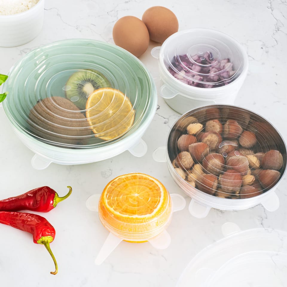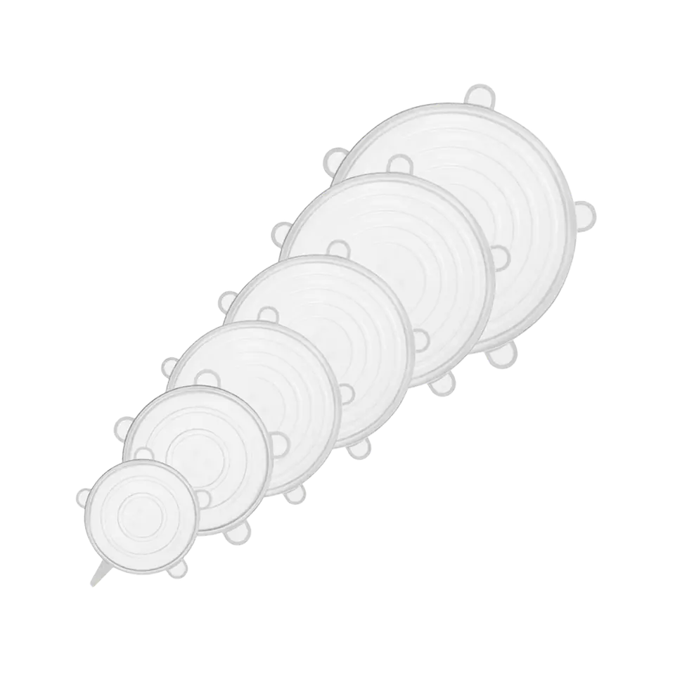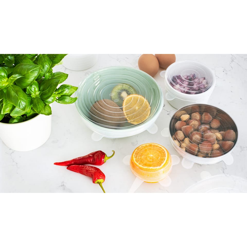 W skład zestawu wchodzi pokrywka silikonowa w sześciu rozmiarach od 6,5 cm do 20,5 cm. Każda z nich posiada praktyczne uchwyty, które ułatwiają precyzyjne zakładanie i ściganie z naczynia.