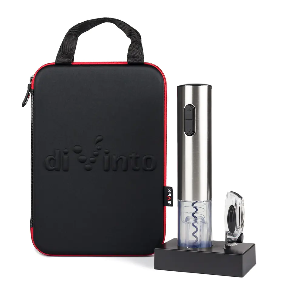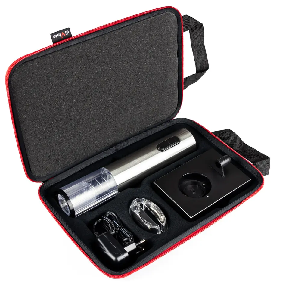 Otwiera wino bez wysiłku Silver Twister Deluxe to nowoczesny i elegancki korkociąg w czarnym etui, dzięki któremu otworzysz ulubione wino szybko i bez wysiłku.W przeciwieństwie do tradycyjnych korkociągów, ten otwieracz do wina jest bardzo wygodny w obsłudze.Wystarczy tylko nacisnąć przycisk, by w kilka sekund i bez użycia siły wyciągnąć korek z butelki. Bez niepotrzebnych nerwów, a do tego jak efektownie! Więcej niż korkociąg do wina Korkociąg prezentuje się wyjątkowo atrakcyjnie, ponieważ jest podświetlany niebieskim światłem diod LED.W zestawie znajdziesz też bazę ładującą. Dzięki temu otworzysz ponad 40 butelek wina bez potrzeby ponownego ładowania korkociągu! Do otwieracza dołączony jest także praktyczny nożyk do usuwania folii, która chroni korek. Wytrzymałe etui Extreme Case Zestaw do wina Silver Twister Deluxe został zapakowany w eleganckie, zapinane na zamek etui, w którym każdy element ma swoje miejsce i jest świetnie chroniony.Dzięki etui Extreme Case z uchwytem przechowywanie akcesoriów jest bardzo wygodne, a do tego można je zabrać w dowolne miejsce i być pewnym, że nic im się nie stanie. Prezentowy zestaw do wina Silver Twister Deluxe to prezent dla miłośnika lub miłośniczki wina, który nie wymaga dodatkowego pakowania – jest elegancki, wyróżnia się i robi świetne pierwsze wrażenie.Każdy wielbiciel wina doceni praktyczny charakter zestawu, w którym nie ma miejsca na zbędne gadżety.Praktyczny zestaw o nietuzinkowym wyglądzie to idealny prezent na ślub, parapetówkę i wieczór panieński.Elegancki korkociąg, który otwiera wino dosłownie w kilka sekund to również pomysł na trafiony prezent świąteczny.