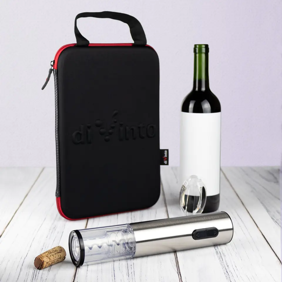 Otwiera wino bez wysiłku Silver Twister Deluxe to nowoczesny i elegancki korkociąg w czarnym etui, dzięki któremu otworzysz ulubione wino szybko i bez wysiłku.W przeciwieństwie do tradycyjnych korkociągów, ten otwieracz do wina jest bardzo wygodny w obsłudze.Wystarczy tylko nacisnąć przycisk, by w kilka sekund i bez użycia siły wyciągnąć korek z butelki. Bez niepotrzebnych nerwów, a do tego jak efektownie! Więcej niż korkociąg do wina Korkociąg prezentuje się wyjątkowo atrakcyjnie, ponieważ jest podświetlany niebieskim światłem diod LED.W zestawie znajdziesz też bazę ładującą. Dzięki temu otworzysz ponad 40 butelek wina bez potrzeby ponownego ładowania korkociągu! Do otwieracza dołączony jest także praktyczny nożyk do usuwania folii, która chroni korek. Wytrzymałe etui Extreme Case Zestaw do wina Silver Twister Deluxe został zapakowany w eleganckie, zapinane na zamek etui, w którym każdy element ma swoje miejsce i jest świetnie chroniony.Dzięki etui Extreme Case z uchwytem przechowywanie akcesoriów jest bardzo wygodne, a do tego można je zabrać w dowolne miejsce i być pewnym, że nic im się nie stanie. Prezentowy zestaw do wina Silver Twister Deluxe to prezent dla miłośnika lub miłośniczki wina, który nie wymaga dodatkowego pakowania – jest elegancki, wyróżnia się i robi świetne pierwsze wrażenie.Każdy wielbiciel wina doceni praktyczny charakter zestawu, w którym nie ma miejsca na zbędne gadżety.Praktyczny zestaw o nietuzinkowym wyglądzie to idealny prezent na ślub, parapetówkę i wieczór panieński.Elegancki korkociąg, który otwiera wino dosłownie w kilka sekund to również pomysł na trafiony prezent świąteczny.