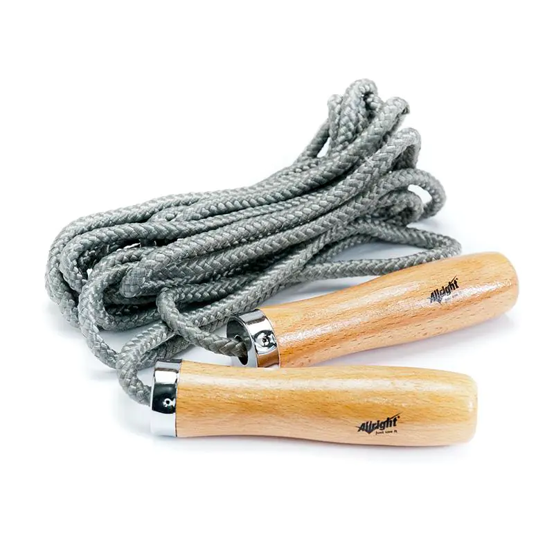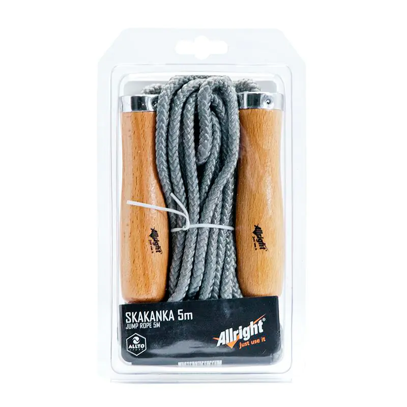 Skakanka 5m Allright nadaje się do treningu sportowego grupowego i osobistego, oraz dziecięcej zabawy wewnątrz i na zewnątrz. • Długość linki – ok 5M, odpowiednia dla 3-4 osób.• Wygodne, drewniane uchwyty.• Gruba poliestrowa linka, odporna na zużycie.• Łożyska kulowe.