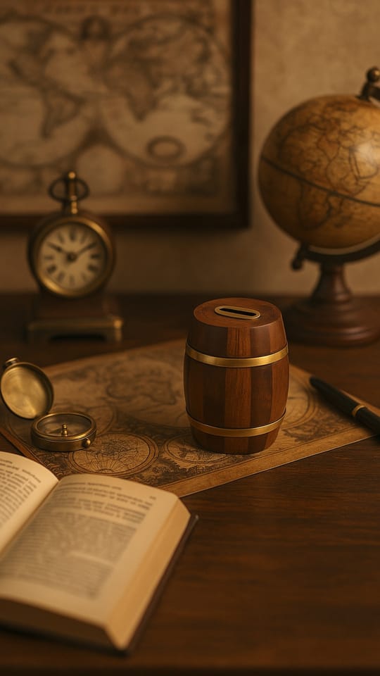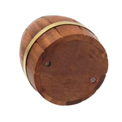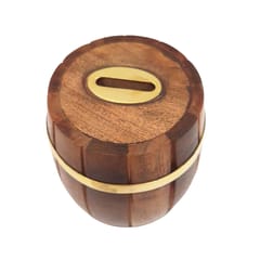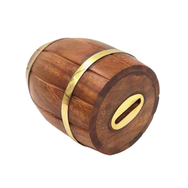 Skarbonka – Beczka - DNU-001 Drewniana skarbonka z okuciami mosiężnymi to połączenie funkcjonalności i estetyki. Dobry pomysł na prezent dla dziecka – pozwoli budować nawyk oszczędzanie pieniędzy. Skarbonka wielokrotnego użytku. Wysokość: 13 cm