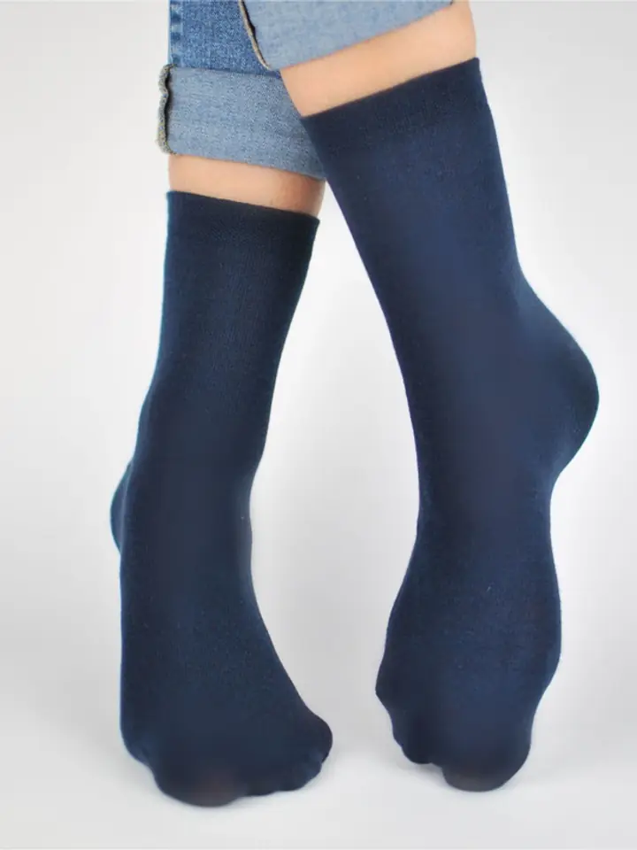 Skarpetki damskie gładkie, wykonane z wysokiej jakości bawełny, przyjemnej w dotyku. Posiadają nieuciskający ściągacz oraz płaski szew. Skład surowcowy: 80% bawełna, 15% poliamid, 5% elastan.