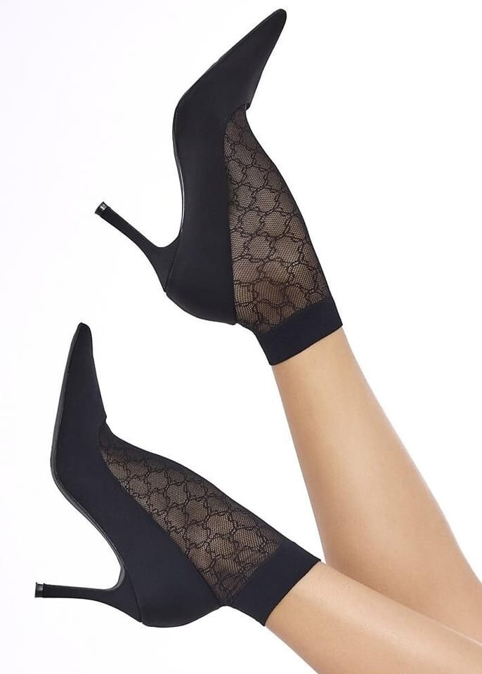 Skarpetki damskie 20DEN, z siateczkowej przędzy poliamidowej ozdobione delikatnym wzorem. Delikatny, bezuciskowy ściągacz i wzmocnione palce. Skład: 100% poliamid.