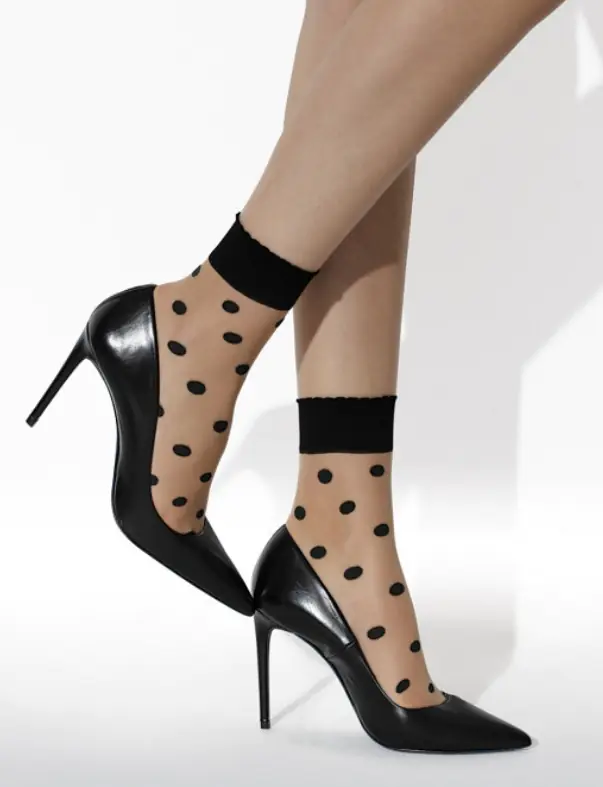 Skarpetki damskie cienkie 20 den, z ozdobnym wzorem w kropki. Czarny ściągacz. Niewidoczne wzmocnienia na palcach. Skład: 88% poliamid, 12% elastan.
