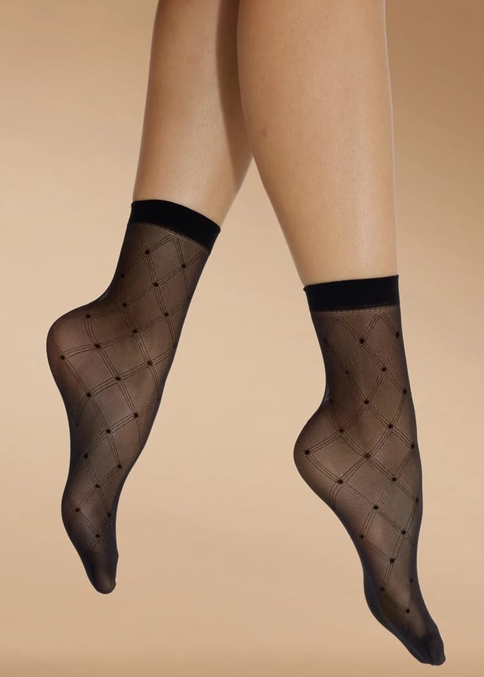Skarpetki damskie z przędzy oplatanej, dzięki czemu są bardziej odporne na zaciągnięcia. Cienkie - 20 den, z ozdobnym wzorem. Czarny ściągacz, niewidoczne wzmocnienia na palcach. Skład: 90% poliamid, 10% elastan.