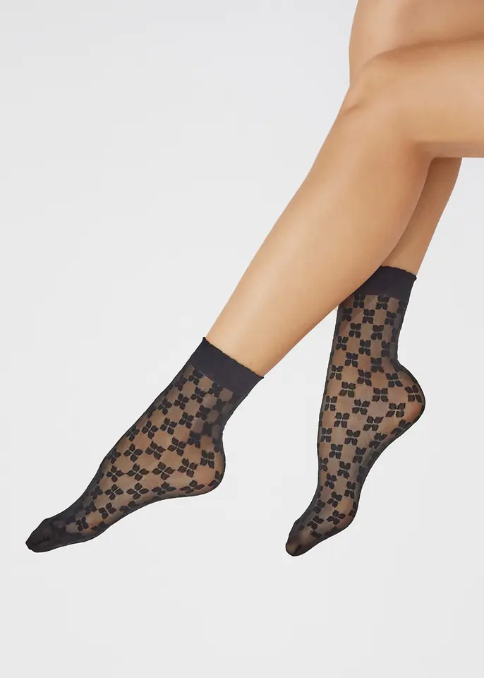 Skarpetki damskie wzorzyste cienkie, grubość 20 den. Zdobiony ściągacz. Skład: 90% poliamid, 10% elastan.