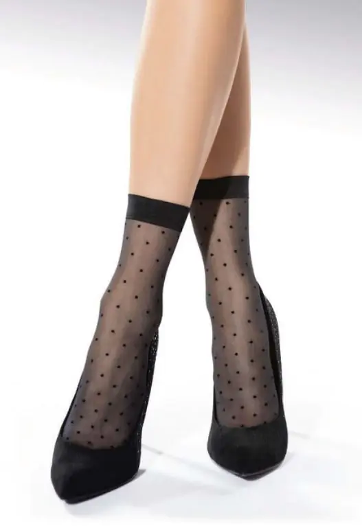 Skarpetki damskie wzorzyste wykonane z przędzy oplatanej typu elastan. Delikatny, bezuciskowy ściągacz. Skład: 90% poliamid, 10% elastan.