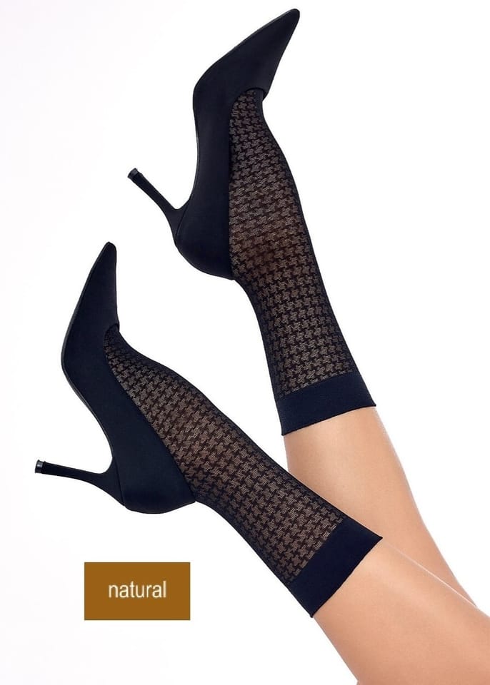 Skarpetki damskie 30DEN, wykonane z przędzy oplatanej ozdobione delikatnym wzorem. Delikatny, bezuciskowy ściągacz i wzmocnione palce. Skład: 85% poliamid, 15% elastan.