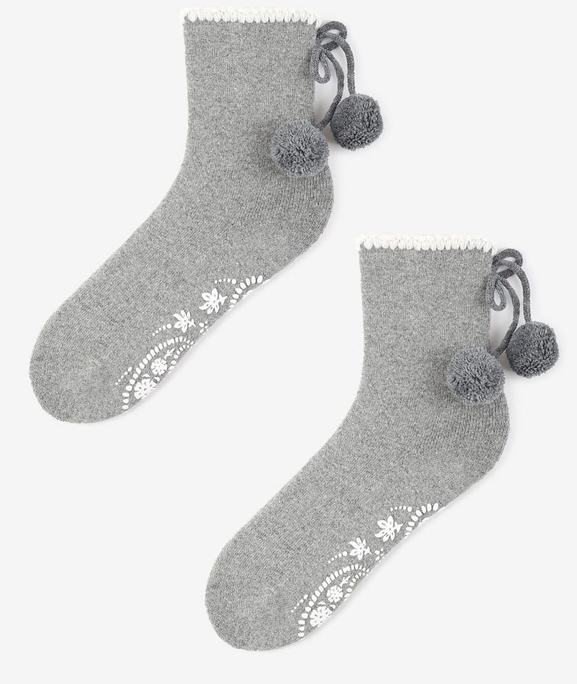 Ciepłe, gładkie skarpetki damskie z pomponami. Wykonane z najwyższej jakości przędzy. Skarpetki są miękkie i komfortowe. Posiadają nieuciskający ściągacz oraz antypoślizgowy spód. Skład: 60% poliamid, 23% akryl, 7% wiskoza, 5% wełna, 3% angora, 2% elastan