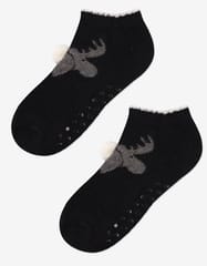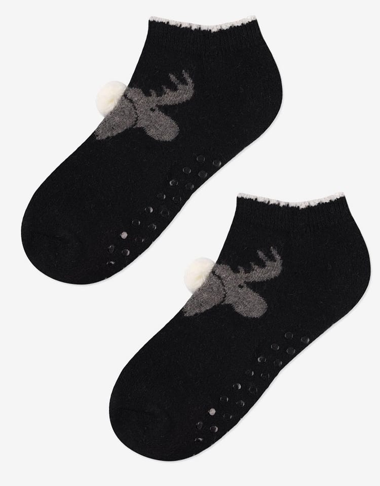Ciepłe, niskie skarpetki damskie z grafiką łosia i pomponem. Wykonane z najwyższej jakości przędzy. Miękkie i komfortowe. Posiadają nieuciskający ściągacz, antypoślizgowy spód. Skład: 60% poliamid, 23% akryl, 7% wiskoza, 5% wełna, 3% angora, 2% elastan.