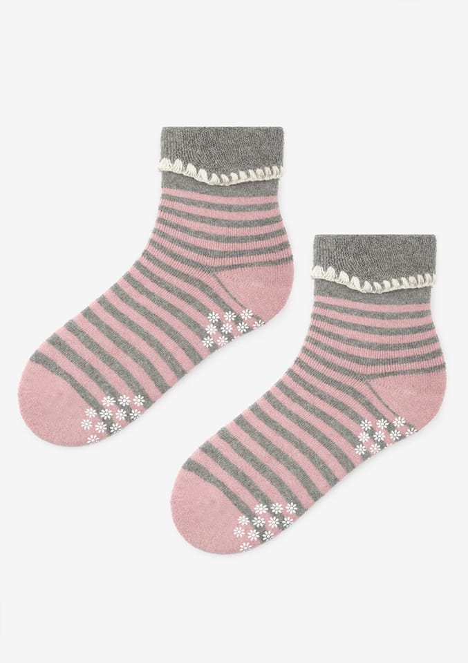 Skarpetki damskie z angory zapewniające ciepło i wygodę z wywijanym ściągaczem. Wzór w paski, podeszwa antypoślizgowa.Skład: 60% poliester, 23% akryl, 7% wiskoza, 5% wełna, 3% angora, 2% elastan