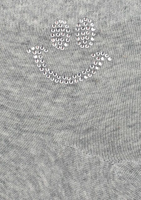 Skarpetki damskie z uśmiechniętą buzią z cyrkonii. Wykonane z naturalnej bawełny najwyższej jakości. Płaski i miękki szew zapewni komfort noszenia. Skład: 75% bawełna, 20% poliamid, 5% elastan.