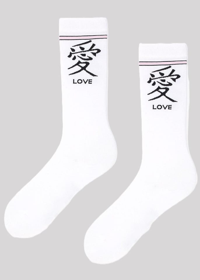Damskie skarpetki wzorzyste z napisem LOVE, dłuższa nogawka, klasyczny krój skarpet z wygodnym ściągaczem. Skład: 80% bawełna,15% poliamid, 5% elastan.