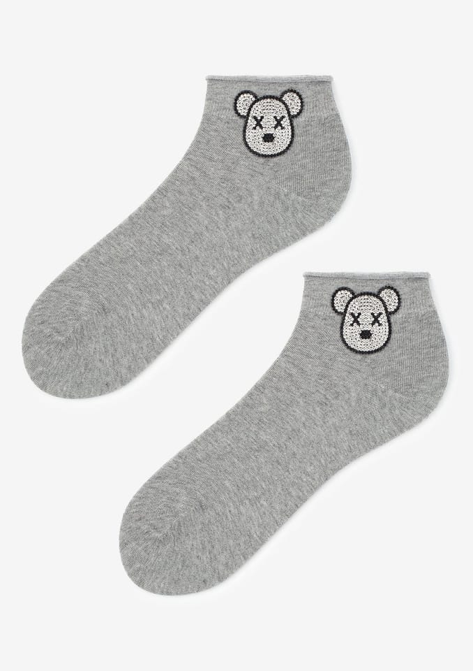 Skarpetki damskie za kostkę z głową misia ze srebrnych i czarnych cyrkonii. Wykonane z naturalnej bawełny najwyższej jakości. Płaski i miękki szew zapewni komfort noszenia. Skład: 75% bawełna, 20% poliamid, 5% elastan.