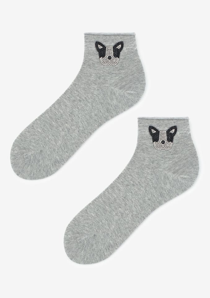 Skarpetki damskie z błyszczącą głową psa. Wykonane z naturalnej bawełny najwyższej jakości. Płaski i miękki szew zapewni komfort noszenia.Skład: 75% bawełna, 20% poliamid, 5% elastan