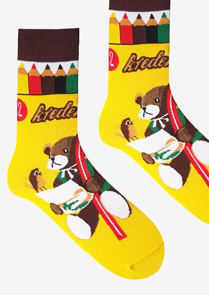 Skarpety damskie z motywem kultowego opakowania kredek o intensywnej, żółtej kolorystyce. Wysokiej jakości dzianina zapewnia wygodę noszenia i elastyczne dopasowanie do stopy. Skład:80% bawełna, 15% poliamid, 5% elastan.