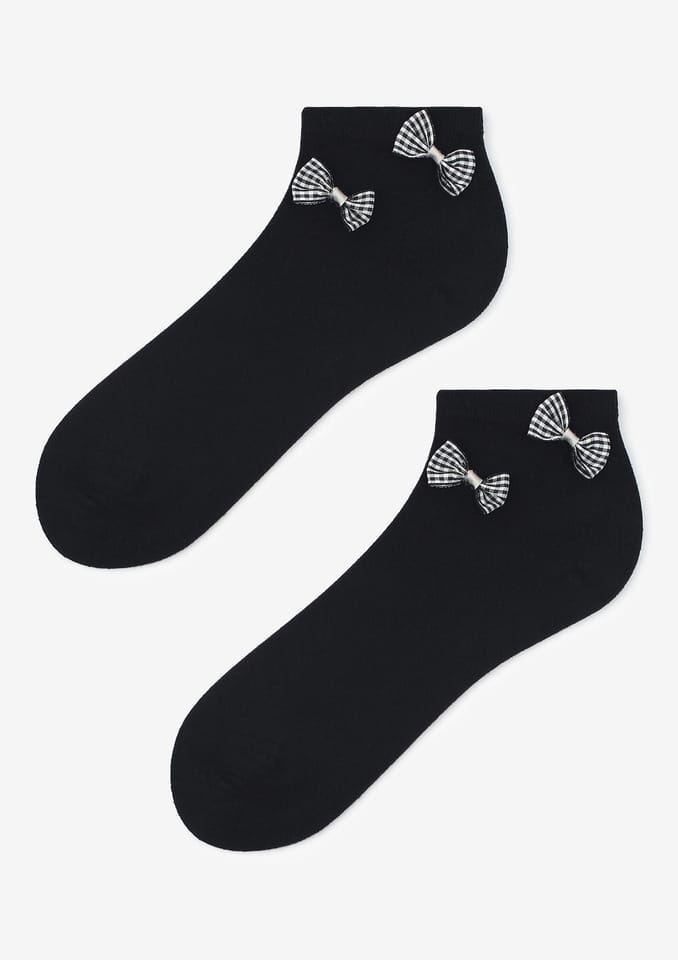 Skarpetki damskie za kostkę z materiałowymi kokardkami w kratkę. Wykonane z naturalnej bawełny najwyższej jakości. Płaski i miękki szew zapewni komfort noszenia.Skład: 75% bawełna, 20% poliamid, 5% elastan