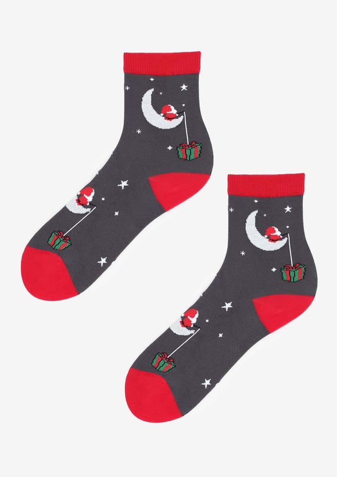 Skarpetki damskie ze świętym Mikołajem na księżycu. Wykonane z naturalnej bawełny najwyższej jakości. Płaski i miękki szew zapewni komfort noszenia. Skład: 80% bawełna, 15% poliamid, 5% elastan.