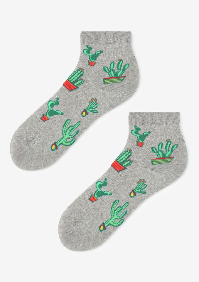 Skarpetki damskie z grafiką kaktusów. Wykonane z naturalnej bawełny najwyższej jakości. Płaski i miękki szew zapewni komfort noszenia. Skład: 80% bawełna, 15% poliamid, 5% elastan.