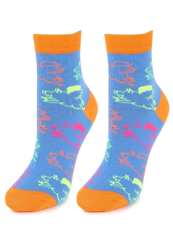 Skarpety damskie z wzorem latających świnek w neonowych kolorach. Wykonane z bawełny najwyższej jakości. Płaski i miękki szew zapewni komfort noszenia. Idealne na prezent. Skład: 80% bawełna, 15% poliamid, 5% elastan.