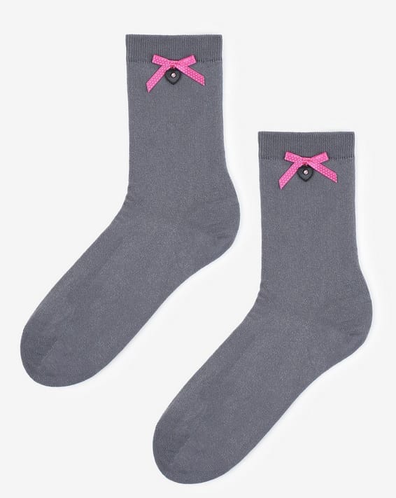 Gładkie skarpetki damskie ozdobione po boku kokardką i zawieszką w kształcie serduszka. Wykonane z naturalnej bawełny najwyższej jakości. Płaski i miękki szew zapewni komfort noszenia. Skład: 80% bawełna, 15% poliamid, 5% elastan.