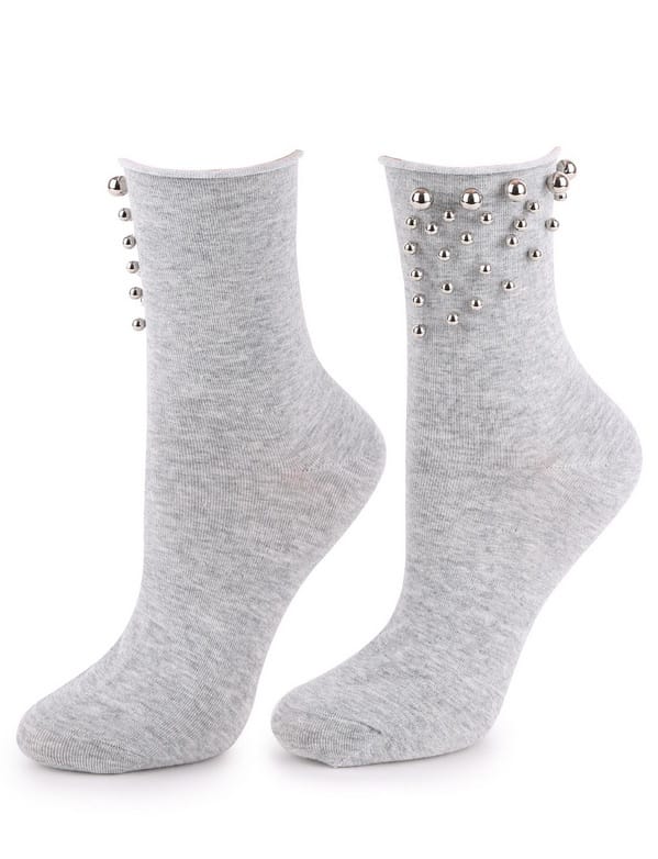 Skarpety damskie ozdobione srebrnymi kuleczkami. Są one niezwykłym połączeniem klasyki i elegancji. Idealne na prezent. Skład: 75% bawełna, 20% poliester, 5% elastan.