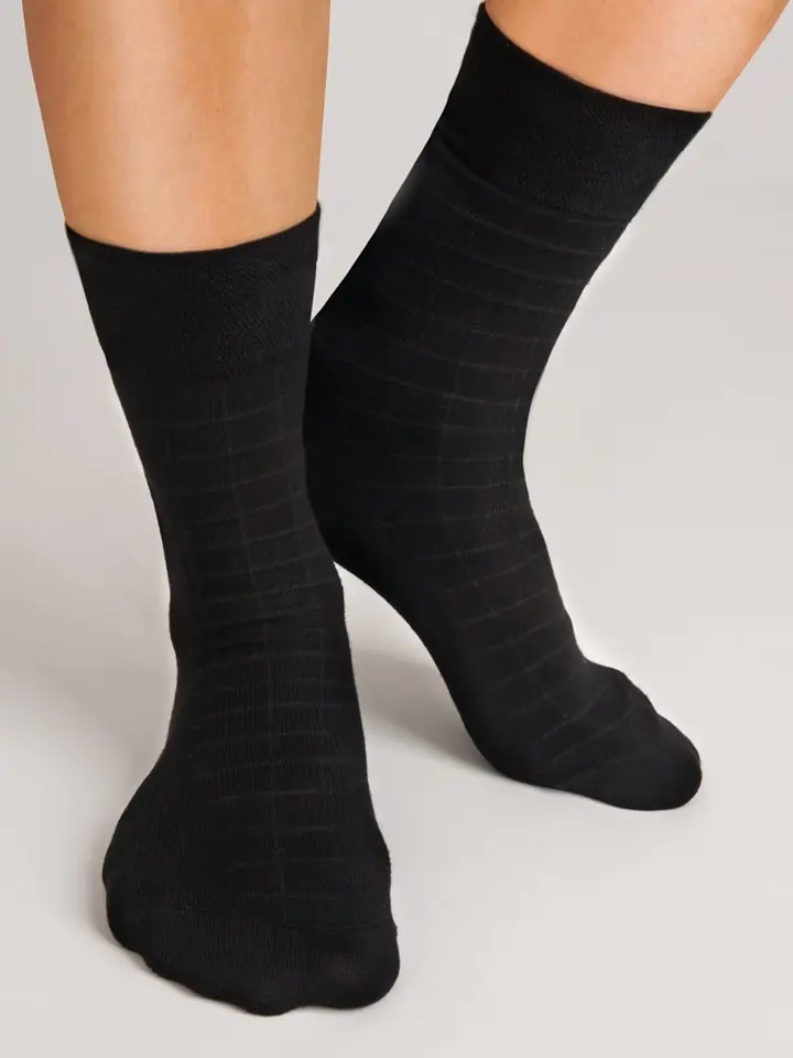 Skarpety męskie garniturowe. Miłe, miękkie włókno bambusowe. Nieuciskający ściągacz, płaskie szwy. Skład: 80% włókno bambusowe, 19% poliamid, 1% elastan.