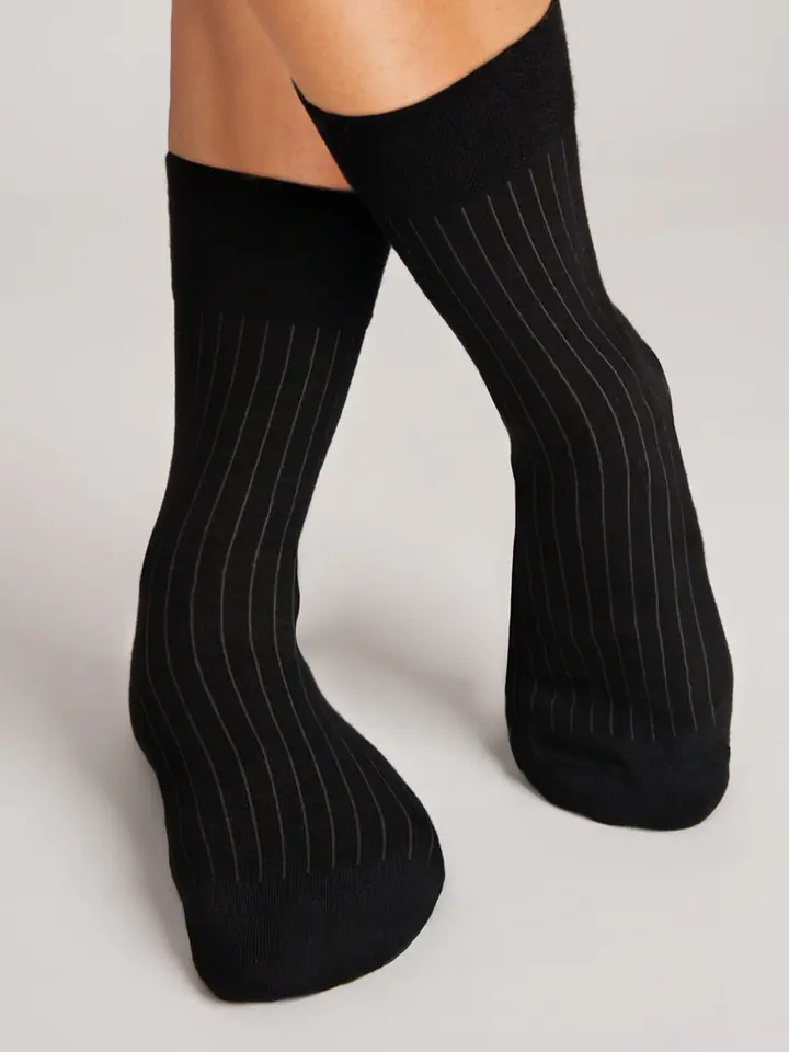 Skarpety męskie garniturowe. Miłe, miękkie włókno bambusowe. Nieuciskający ściągacz, płaskie szwy. Skład: 80% włókno bambusowe, 19% poliamid, 1% elastan.