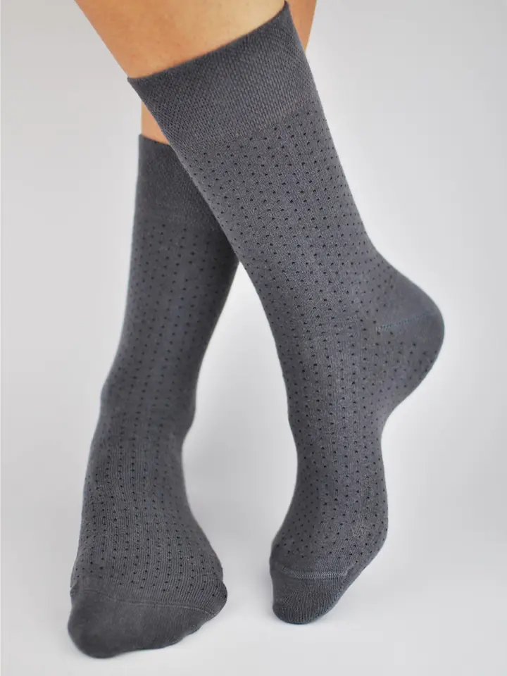 Wzorzyste bawełniane skarpetki męskie. Skarpetki z płaskim szwem i nieuciskającym ściągaczem. Skład: 80% bawełna, 18% poliamid, 2% elastan.