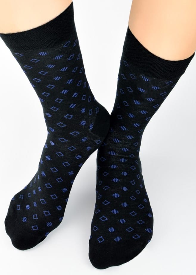 Skarpety męskie wykonane z wysokiej jakości bawełny w ozdobne granatowe romby. Płaskie szwy, nieuciskający ściągacz zapewniają komfort i wygodę. Skład: 80% bawełna, 18% poliamid, 2 % elastan.