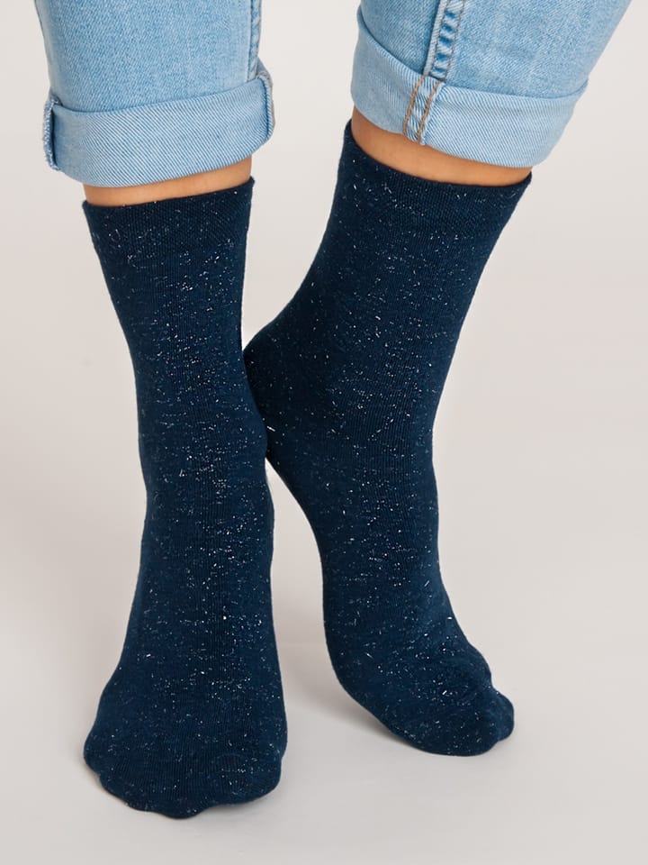 Skarpetki damskie wykonane z wysokiej jakości materiałów. Nieuciskający ściągacz, ozdobione połyskującą nitką. Skład: 80% bawełna, 18% poliamid, 2% włókno metalizowane, 1% elastan.
